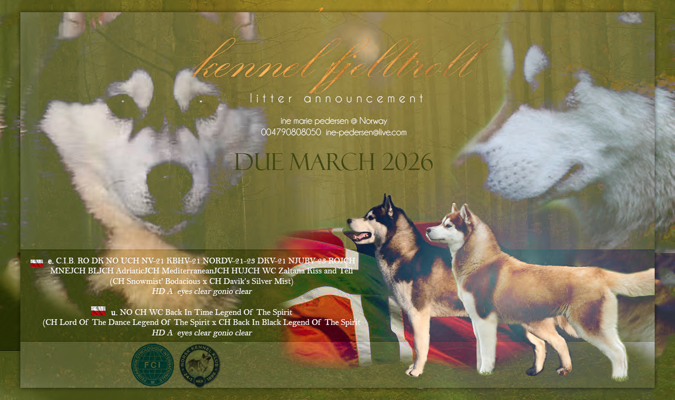 Valper planlegges våren 2026, etter to svært solide, gode raserepresentanter. De er både utstilt en hel del, og har gjennomført trekkhundprøve til 1.premie. Begge to har kull fra før, med gode resultater både innen utstilling, helse, gemytt og hundekjøring.